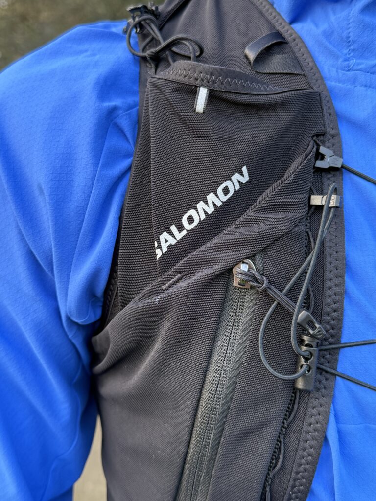 Salomon a porté une attention particulière à l’ergonomie. Les poches avant accueillent deux flasques de très grande qualité, fournies avec le gilet, parfaitement maintenues et faciles à utiliser en courant. Les poches zippées sécurisent téléphone, clés ou matériel sensible, tandis que les poches extensibles accueillent gels, barres ou gants.