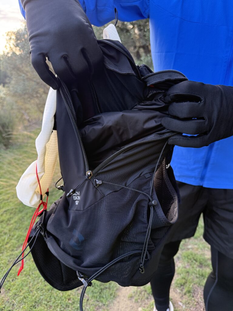 Avec ses 12 litres de volume, le Salomon ADV Skin 12L offre suffisamment d’espace pour transporter tout le matériel indispensable : nutrition, veste imperméable, couche thermique, accessoires obligatoires en course et même bâtons. La poche arrière principale, particulièrement généreuse et facile d’accès, permet de ranger du matériel volumineux sans créer de déséquilibre.