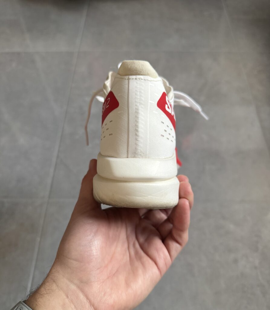 Autre point à prendre en compte, la durabilité de la semelle intermédiaire et extérieure semble limitée, avec des signes d’usure visibles après moins de 100 km. Ce modèle doit donc être considéré comme une chaussure de course, à réserver aux compétitions et aux séances clés. Enfin, le prix est élevé (250€), même s’il reste dans la moyenne des chaussures carbone haut de gamme actuelles.